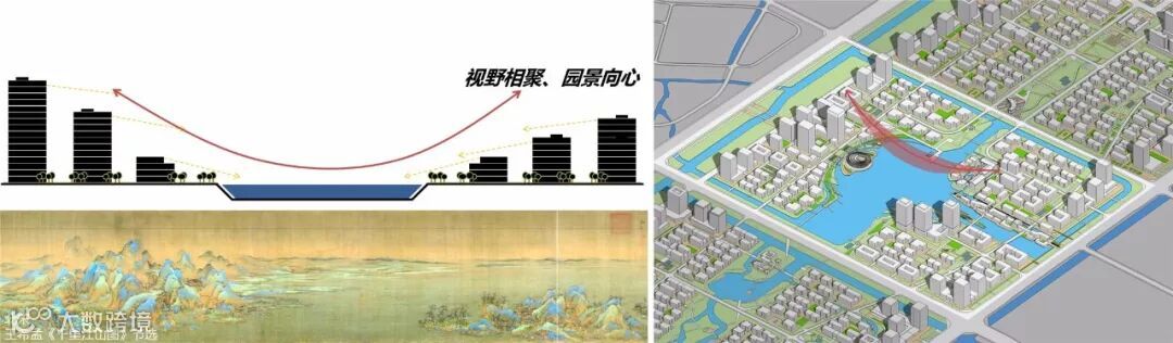 设计借鉴《千里江山图》山水画的意境,将山水环抱、藏风聚气的中国山水理念运用到园区空间组织,体现“仁者乐山、智者乐水”的大境界。空间组合实现景观视野的最大化,以获得更好的社会效益。
