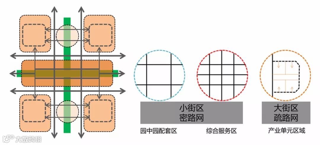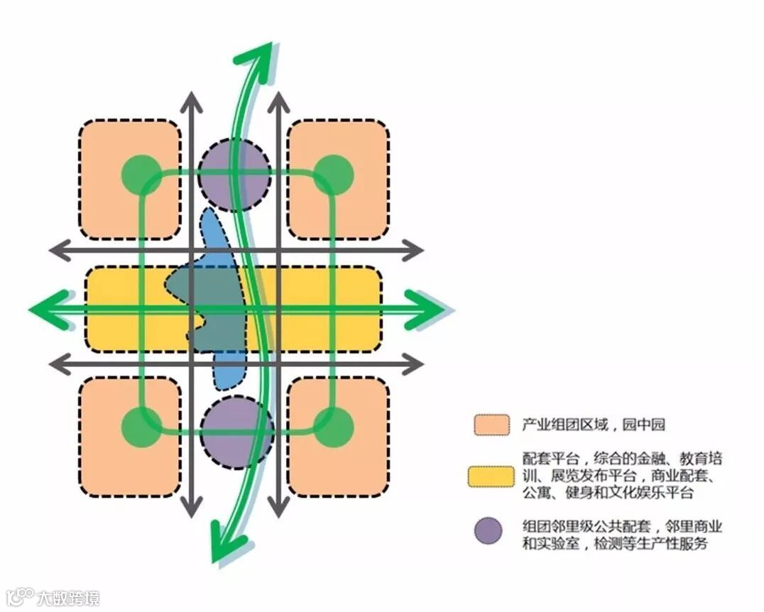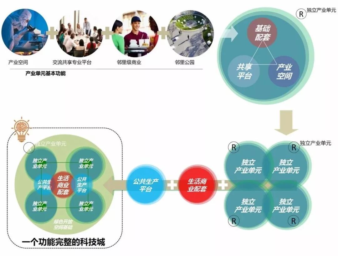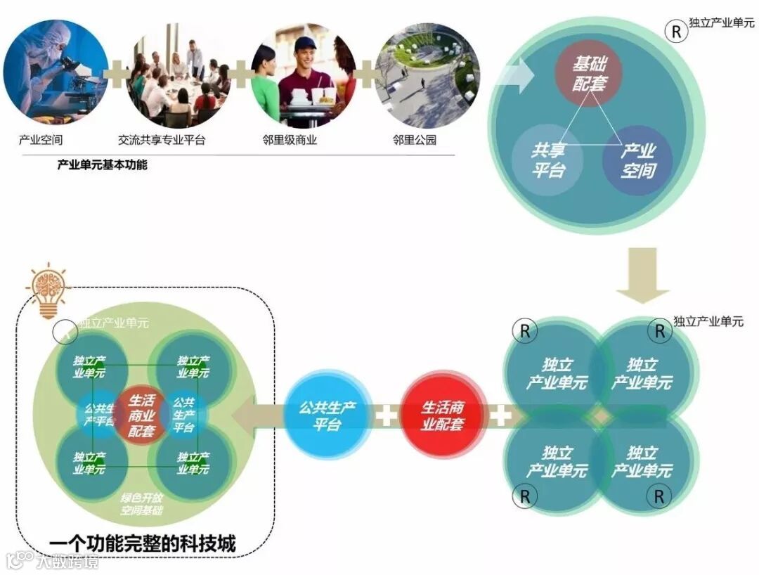 规划引入产业单元的概念,将园区打造成为“综合服务平台+产业单元”的全方位、产城融合新型园区。综合服务平台涵盖金融、教育培训、展示发布平台以及综合的商业配套、人才公寓和文化休闲空间。多个产业单元,形成紧密的上下游合作关系;产业单元内部提供专业、细分的共享与交流空间;基础配套提供邻里级日常生活服务,解决科技人才就餐、休憩、便利店购物等日常生活需求。
