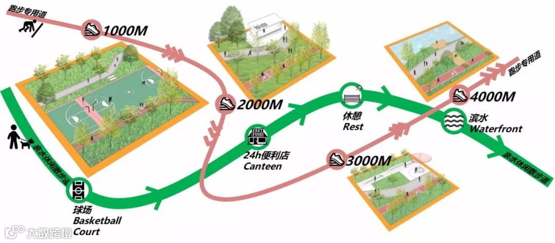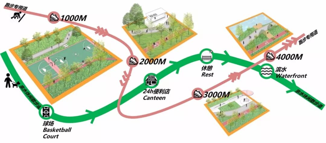 ▼4500米的跑道与散步道,沿线布置多元运动休闲场地