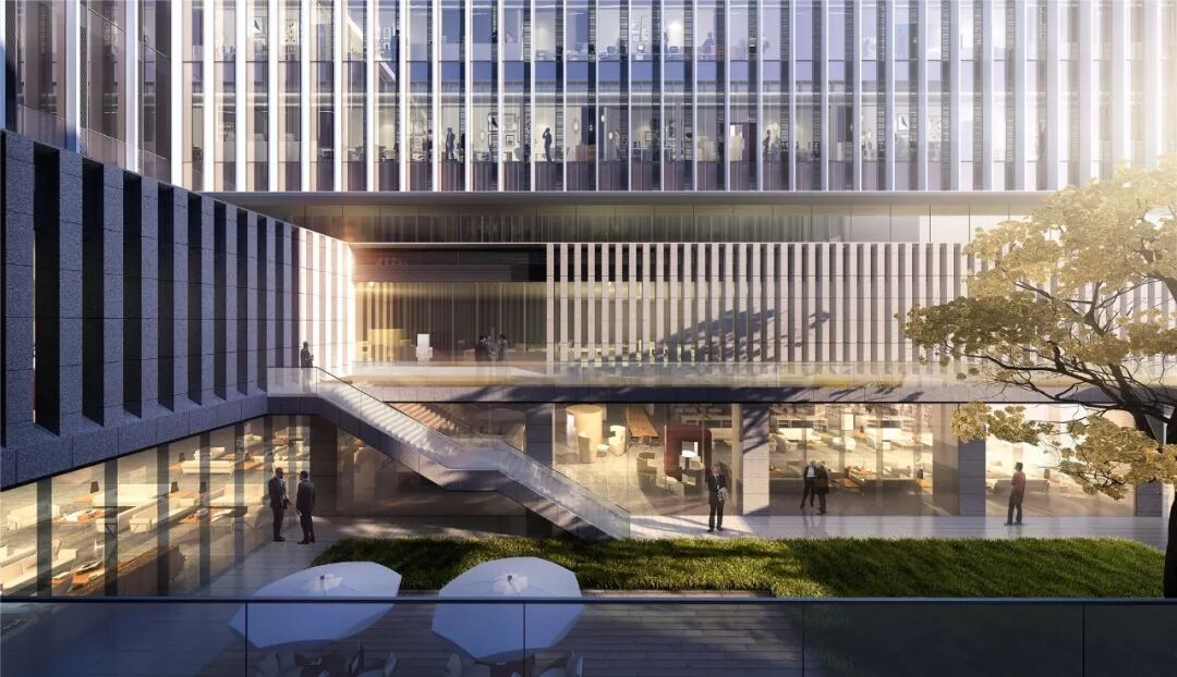 金融商务办公空间讲求集聚效应和配套服务功能,注重高品质环境。设计对传统塔楼要素拆分重组,加入通廊元素,一体化设计,强化集聚效应。商务办公建筑内部功能分区明确,裙房区域布置多功能厅、公共会议室、活动通廊、休憩空间等多种配套功能。设计通过强化建筑内外生态共享空间,构建商务办公建筑的生态环境微系统。