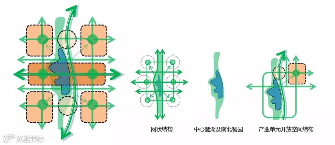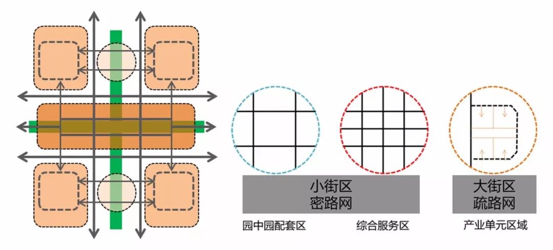 点线面结合的开放空间结构与网格状组织的交通流线,共同构筑环网式布局、各组团紧密联系的园区空间架构。