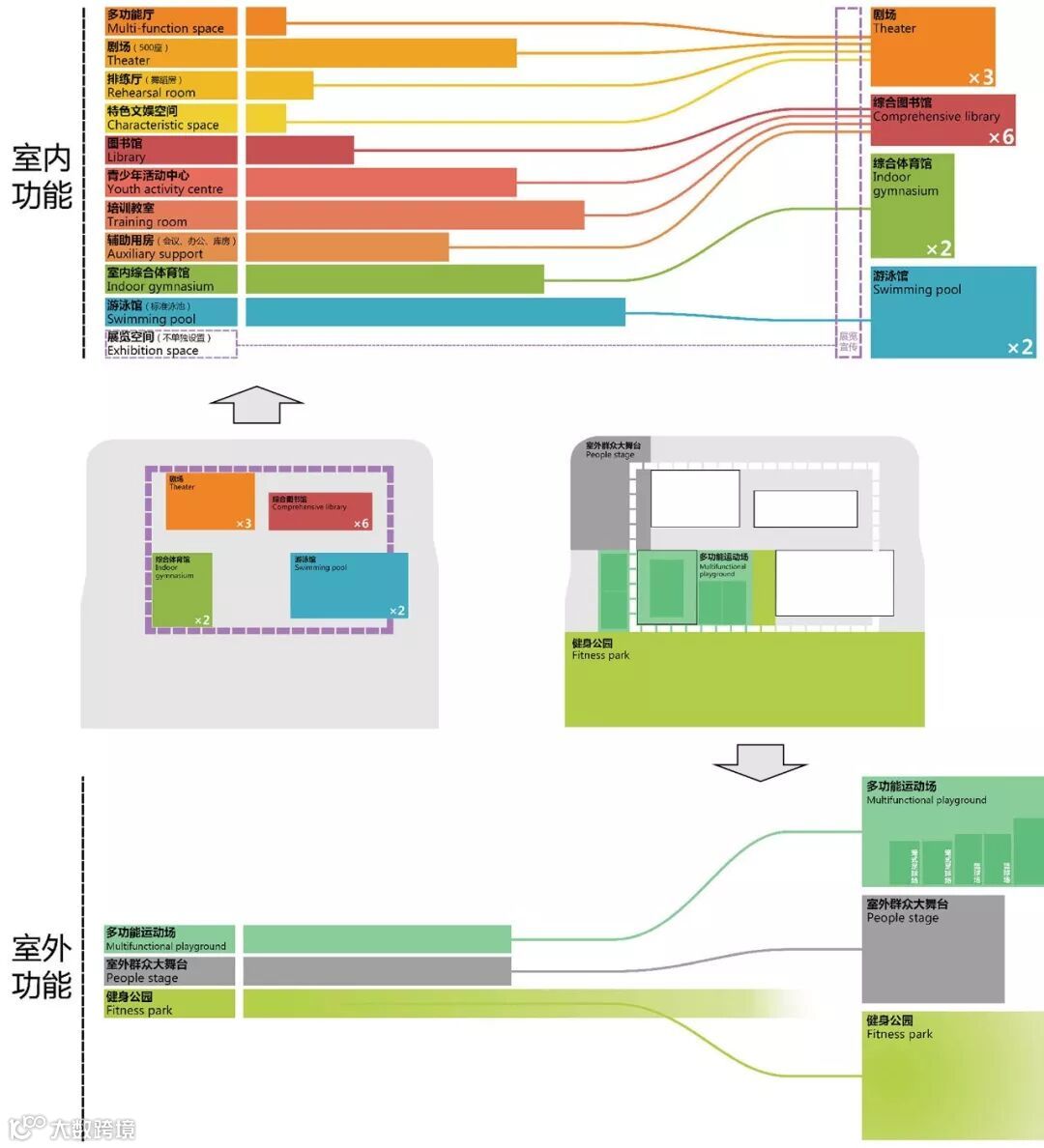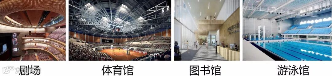 功能配置上,室内主要有图书馆、剧场、多功能厅、文化展览空间、青少年活动中心等公共文化设施和综合体育馆、游泳馆等公共体育设施,室外有多功能运动场,并巧妙地嵌入了群众大舞台。