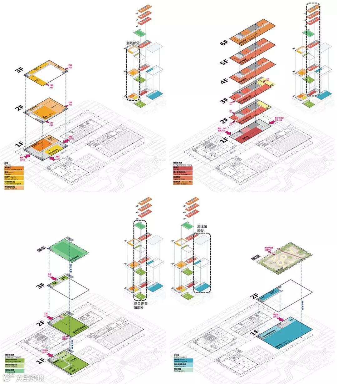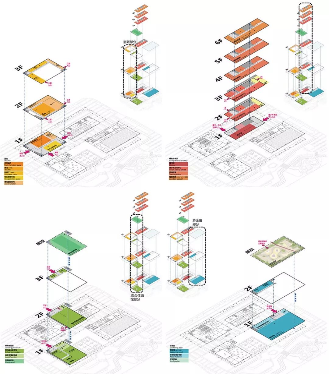 剧场部分合理利用空间层高,一层设置多功能报告厅,二层为剧场,利用局部上空空间设置排练厅,功能紧凑。综合图书馆为青少年活动中心、培训中心分别设置独立出入口,避免人流交叉同时也方便管理。充分考虑学生、家长的需求,设置多样的学习空间与家长等候区。综合体育馆的设计从健身者的行为习惯出发,合理安排流线与功能,并设置零售处满足人们运动后的需求。游泳馆在设计中充分利用层高设置夹层,并利用屋顶平台,为青少年活动中心提供室外运动场地。