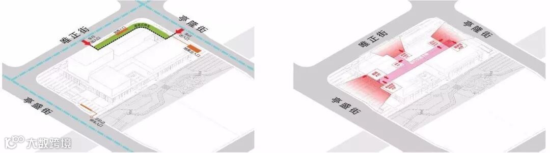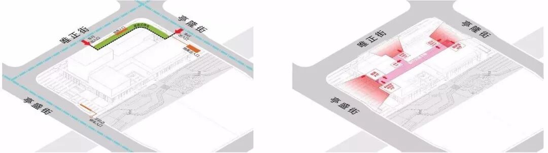 根据机动车出入口条件限制,将场地出入口设在北侧及东侧,并就近设置地库出入口,实现人车分流,同时为满足任务要求,在青少年活动中心出入口设置港湾式落客区。四个场馆独立运营,出入口面向城市开放,具有很强的昭示性,同时又被“交通主轴”串联,方便往来于不同场馆的使用者。