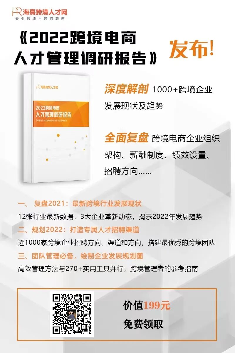 《2022跨境电商人才管理调研报告》通过对1000+家跨境电商企业进行调研,结合真实行业数据,深度剖析跨境趋势、人才招聘、团队管理、培训激励以及发展体系。