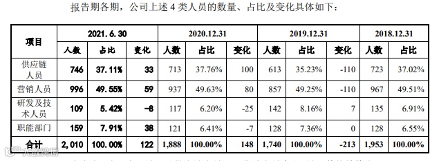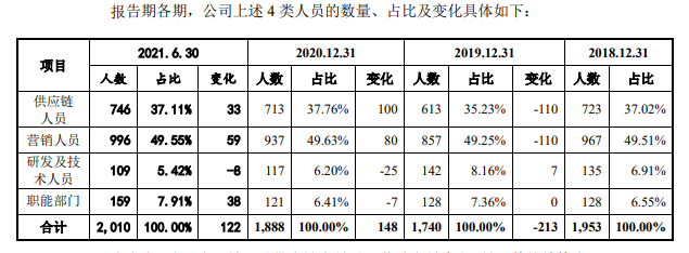招股书显示,赛维时代的员工总数为2010人,境内员工1935人,占比超96.27%。其中,大部分员工为供应链人员及营销人员。