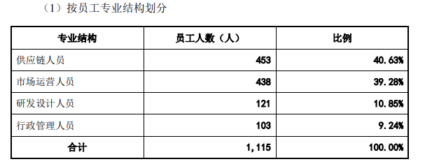 招股书显示,致欧家居员工总数为 1,115 人,供应链人员和市场运营人员为主要构成人员,分别占比40.63%、39.28%。其次,研发设计人员、行政管理人员各有121人、103人,分别占比10.85%、9.24%。
