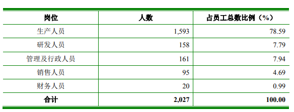 招股书显示,该公司的薪酬主要包含基本工资、相关津贴、绩效奖金和年终奖等,其员工总数为2,027 人,其中生产人员有1593人,占比78.59%;研发人员、管理及行政人员、销售人员、财务人员分别为158人、161人、95人、20人。