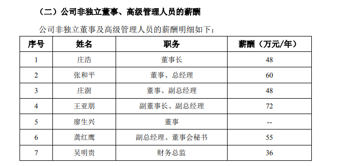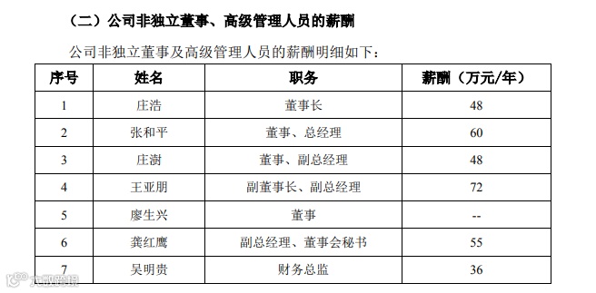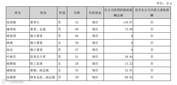 董事长张国根从公司获得的税前报酬总额118.97万元,董事、总裁施明取从公司获得的税前报酬总额73.08万元,财务总监、副总裁张健群从公司获得的税前报酬总额69.65万元。