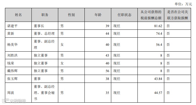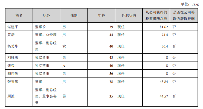 其中,董事长谌建平从公司获得的税前报酬总额81.62万元,董事、总经理黄新从公司获得的税前报酬总额74.4万元,财务总监朱德颜从公司获得的税前报酬总额45.47万元,董事、副总经理、董事会秘书周波从公司获得的税前报酬总额44.57万元。
