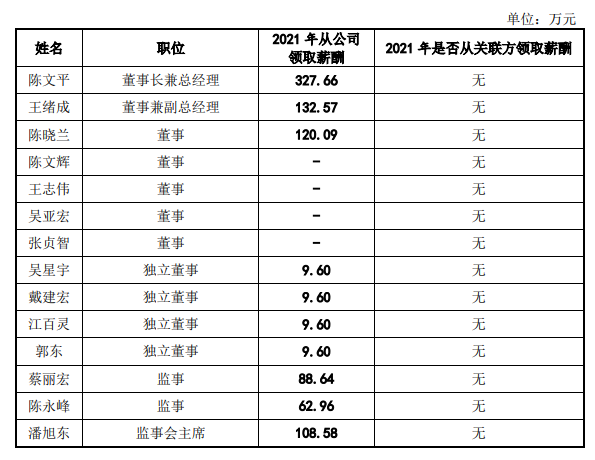 在赛维时代的招股说明书里,可以得到2021年的高管薪酬参考。招股书透露,赛维时代董事、监事、高级管理人员及其他核心人员2021年在公司领取薪酬总额1985.82万元。董事长、总经理陈文平2021年领取薪酬为327.66万元。