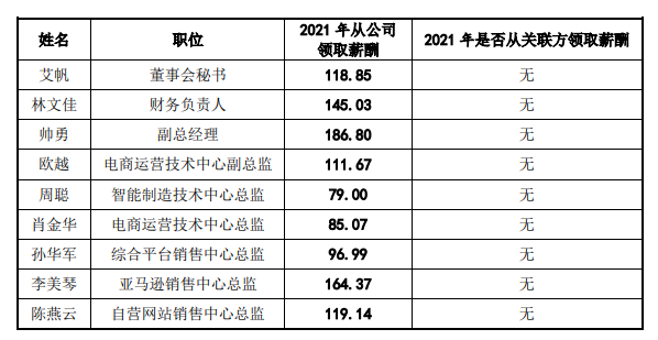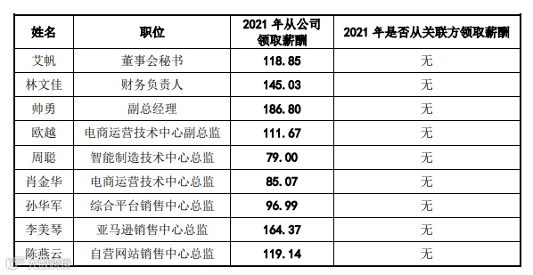 除了董事、监事和总经理,财务负责人、亚马逊销售中心总监、自营网站销售总监都能达到年薪百万。