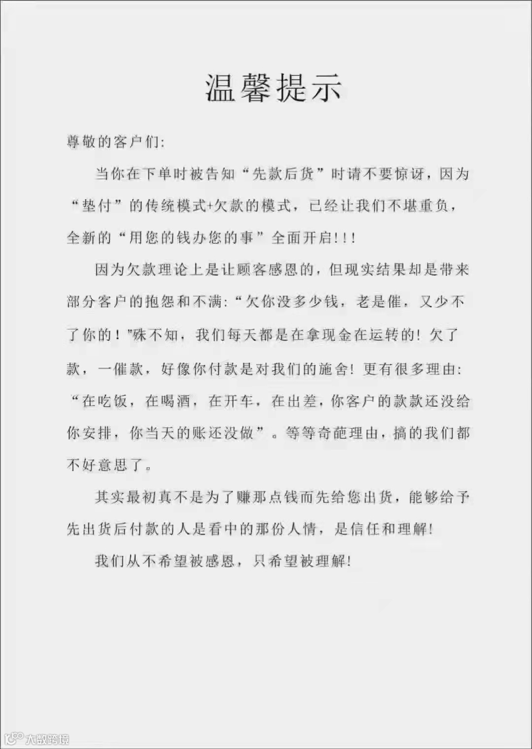 从他的角度来看,在客户困难时因为信任而承担风险出货,最后换来的却是客户的种种拖欠理由,选择取消账期模式也就不难理解了。