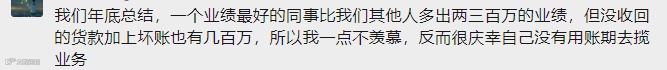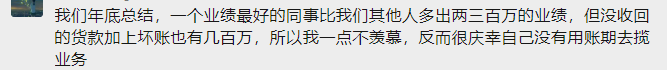 有外贸业务员表示,年底总结时一个业绩最好的同事,比我们多出两三百万的业绩,但没收回的货款加上坏账也有几百万,很庆幸自己没有用账期去揽业务。