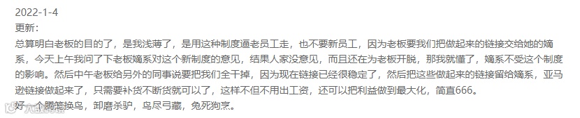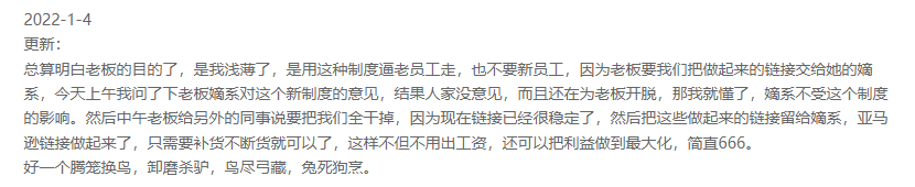 后来,该运营又爆料,老板是想用这种制度逼老员工离职,把老员工做起来的链接交给嫡系。这样一来,老板不用出工资就可以把利益做到最大化。