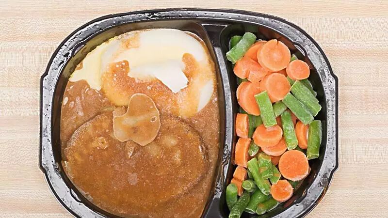 1953年,斯旺森有个工作人员误算了感恩节当日计划销售的火鸡数量达26吨!有些脑洞比较大的人就想出一个办法:把火鸡切片,然后再在旁边放点点缀的小菜。于是,冷冻快餐(TV dinner)就这么产生啦。