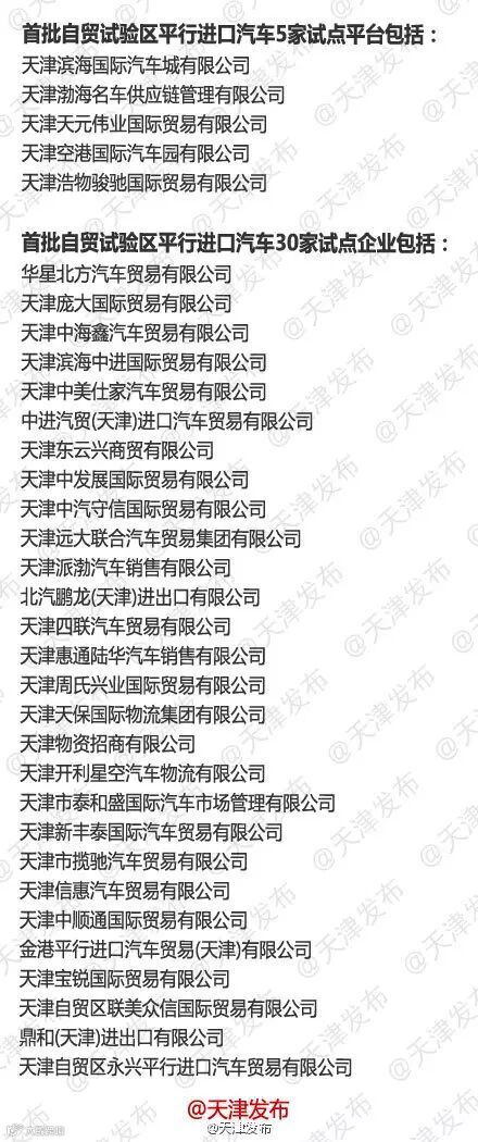 天津自贸区公布平行进口车试点名单 涉多家公司