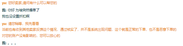 目前,卖家开case询问了亚马逊客服,但得到的回复是:当前也有其他卖家反馈爆单的情况,但经过核实,并不是系统出现问题,这个是正常下单的,也不是恶意下单,不会对您的账户产生影响。”