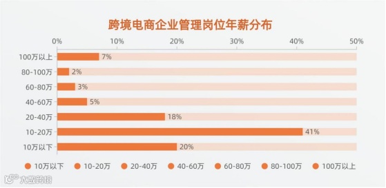 据海熹跨境人才网的调查,中小跨境电商公司的管理层年薪主要集中在10-20万,占比40%。其次,年薪20-40万占比在18%。也就是说,大部分亚马逊运营主管的月工资基本在8-16K之间。