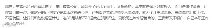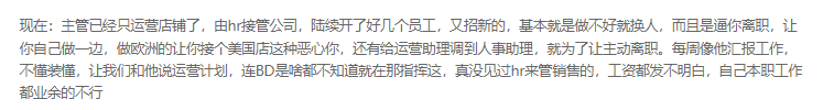 “HR已经陆续逼走好几个员工,做欧洲站的让你接手美国站店铺,把运营助理调到人事助理。真没见过HR来管销售,工资都发不明白,业余得不行。”该运营吐槽道。