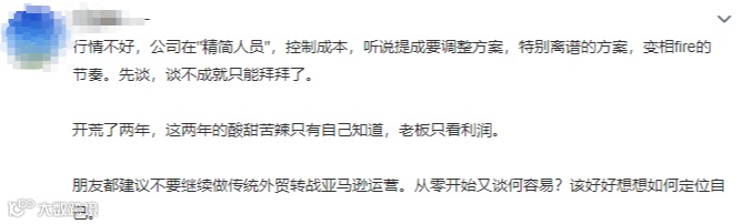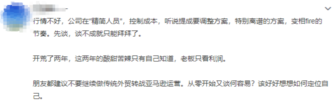 另一位外贸人也表示,市场行情不好,公司在精简人员控制成本。听说要调整提成方案,变相逼人离职。开荒两年了,辛酸苦辣只有自己知道,老板只看利润。