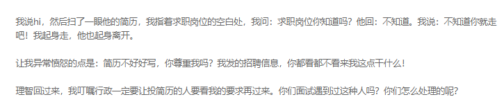 “看到去了还要写简历的公司,我一声不吭扭头就走,别管你公司有多牛,薪水给多高。”