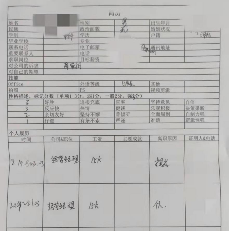 据了解,该求职者拥有2年工作经验,先后担任过两家公司的电商主管,业绩十分亮眼,应聘的是亚马逊产品运营岗位。面试当天,求职者超时5分钟才到。到达后,被要求重新填写一份简历。简历内容如下: