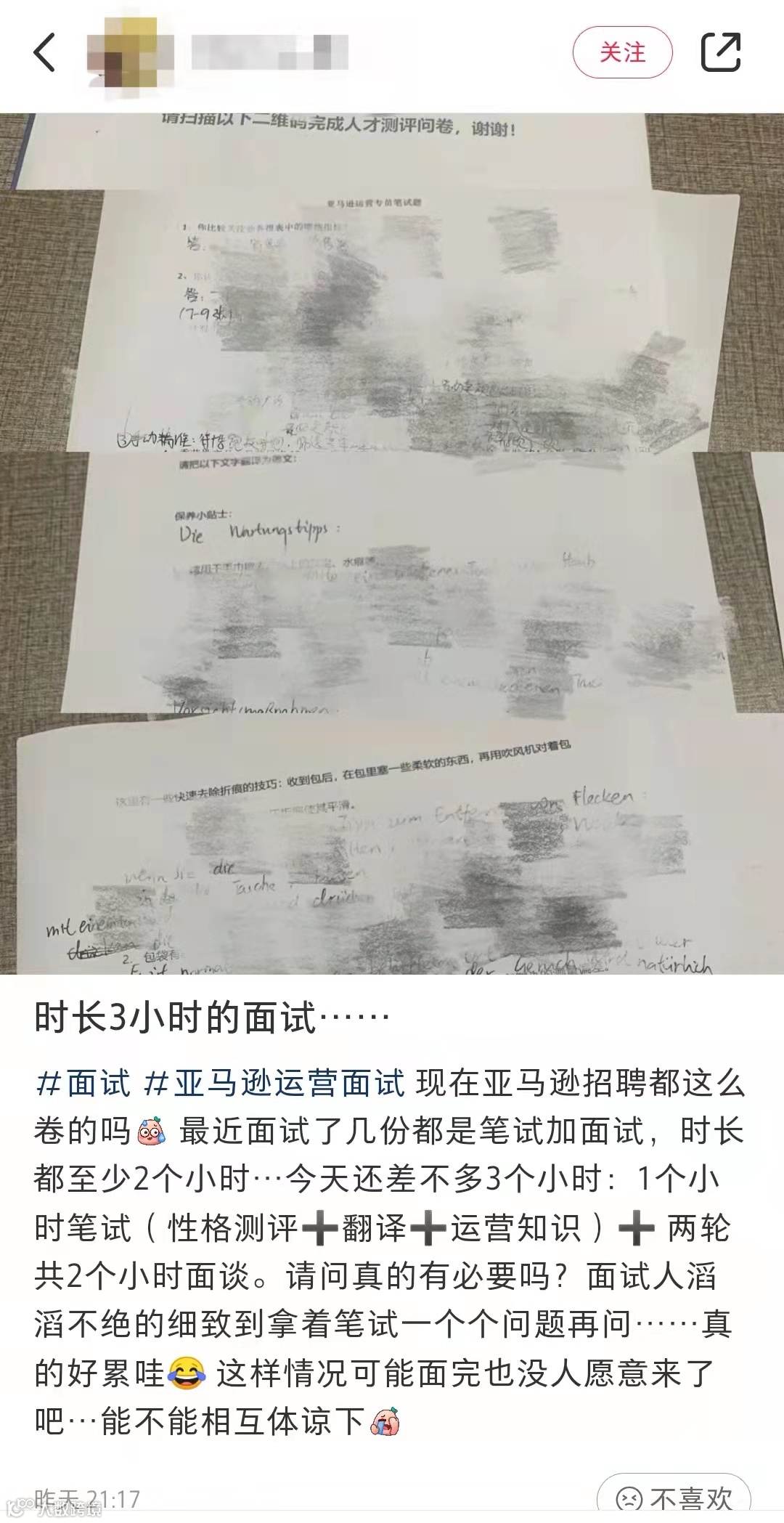 但也不代表面试时间越长越好。近日,一位亚马逊运营吐槽,最近面试的几个公司都是笔试加面试,时长至少2小时,今天甚至长达3小时,包括1小时笔试(性格测评、翻译、运营知识)+两轮共2小时的面谈。