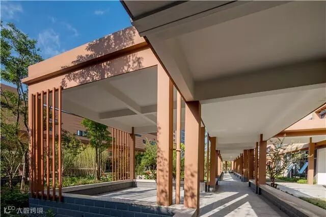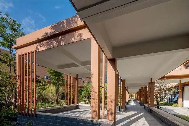 因为养老项目的特殊性,设计中我们重点突出了“适老化”特征,以“步行优先,以人为本”为理念,避免了车行交通对内部人行区域的影响;室外的风雨连廊系统连接起各功能组团,结合景观平台形成了丰富的空间层次,为老年人创造了一个舒适安全的全天候步行环境。