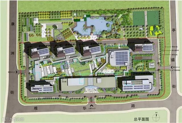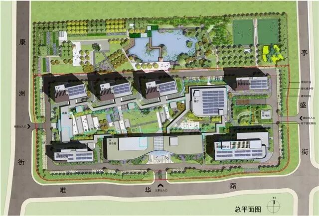 项目在规划上以周边道路、建筑为参考,形成统一的形态肌理,与城市天际线及区域规划相协调。基地西北能远眺阳澄湖畔的高尔夫球场美景,向东能看见青剑湖,是一块优美的清静场所。南面跨街便是建设中的唯亭医院,便于急救和治疗。公寓包括综合楼、配套服务楼、餐厅、普通养老单元、养老公寓等几大功能区块。