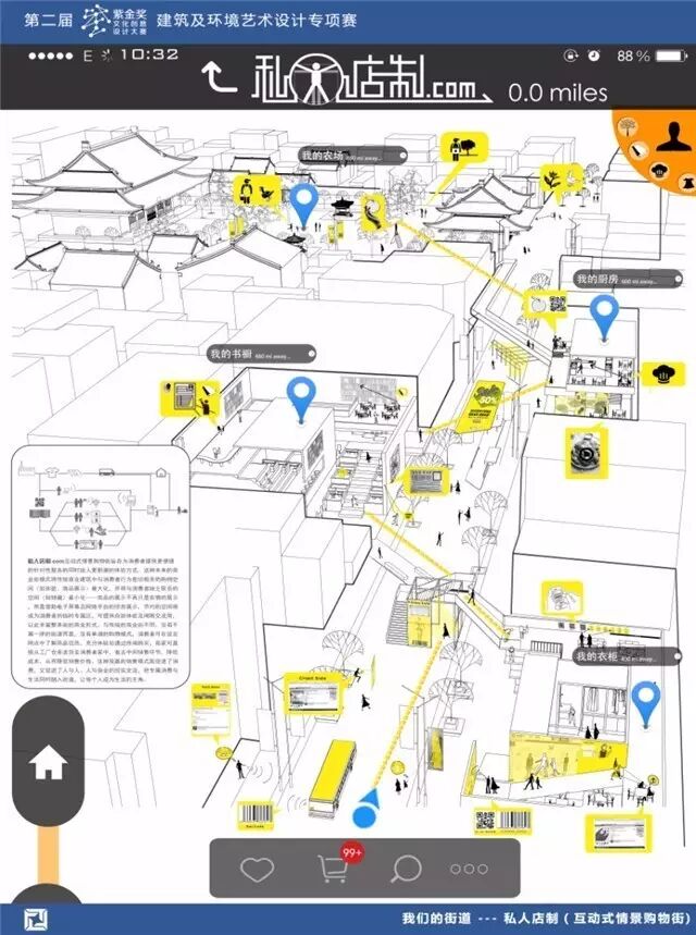“我的”——我们试图强调设计的专属性以及人本性,旨在为消费者“我”提供更多的互动与交流,从而增加体验的新奇感。“衣柜”、“书橱”、“厨房”这些是私有的东西,我们将私有的资源公共化,也就是将数据整合形成体系,再将数据分析后的成果反馈,这是一个增加效率、增加消费者与商业街的互动的行为。