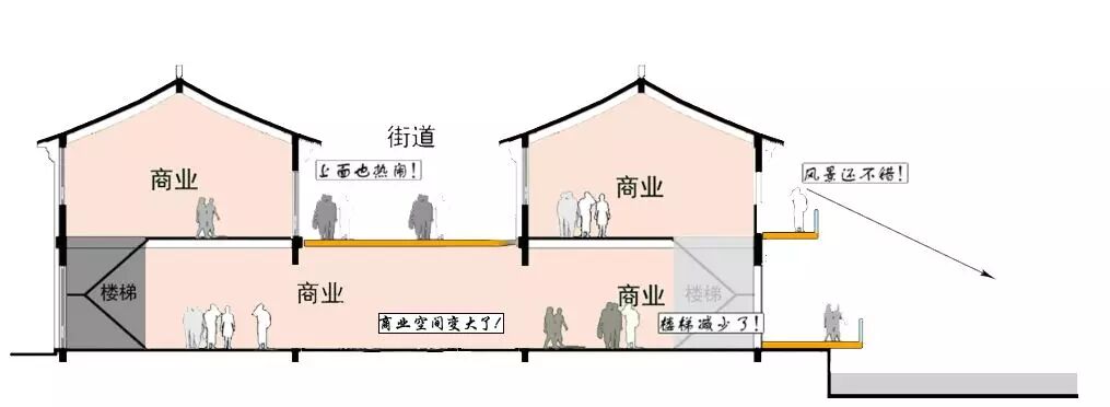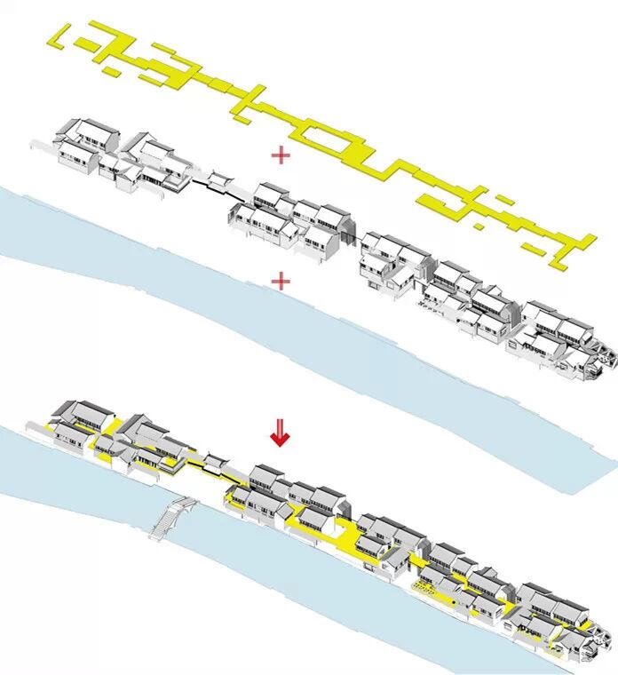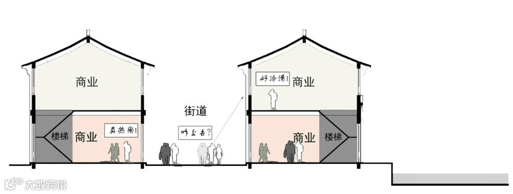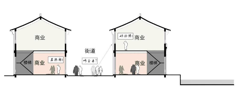 在织补古城肌理的规划原则之下,设计之初拟沿用苏州传统民居式的小体量建筑。然而,若采用传统建筑体量作为商贸空间使用,将面临三个问题:①传统建筑空间进深小,对现代商业空间的使用、业态带来限制;②传统临街商业建筑二层多为居住空间,若直接更换为商业空间,其商业活力及利用价值受到限制;③苏州民居围合感极强,庭院的内向性与商业的外向性相矛盾。