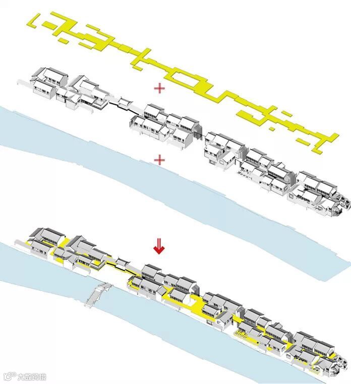 建筑的立面形式延续传统建筑的开间比例,简化形式,用新材料钢材对传统木材进行更新。