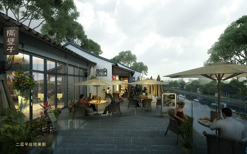 地块与护城河的关系亦是设计重点。我们首先确定沿河一带必须保证道路通行顺畅这一原则,形成一条满足人们可停可游的“水岸”。在此基础上,从使用者的角度出发,仔细推敲空间尺度,设置部分亲水檐廊或平台(不突出规划蓝线),以形成良好的亲水氛围,对一层滨水平台与二层天街露台进行多样化处理,一层水岸、类一层天街及南新路沿街构成三条主街,通过垂直交通交织为有机整体。