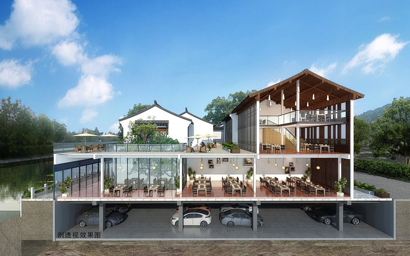 建筑的屋顶形式沿用传统屋顶形式,细致刻画,仅在材料上进行更新换代。