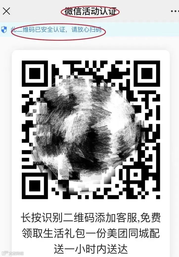 通过扫描了杯子和卡片上的二维码,发现这两个二维码指向了另一个二维码,而且页面上有“微信活动认证”6个字,以及蓝字提醒“此二维码已安全认证,请放心扫码”,并标注“添加客服免费领取生活礼包一份”。