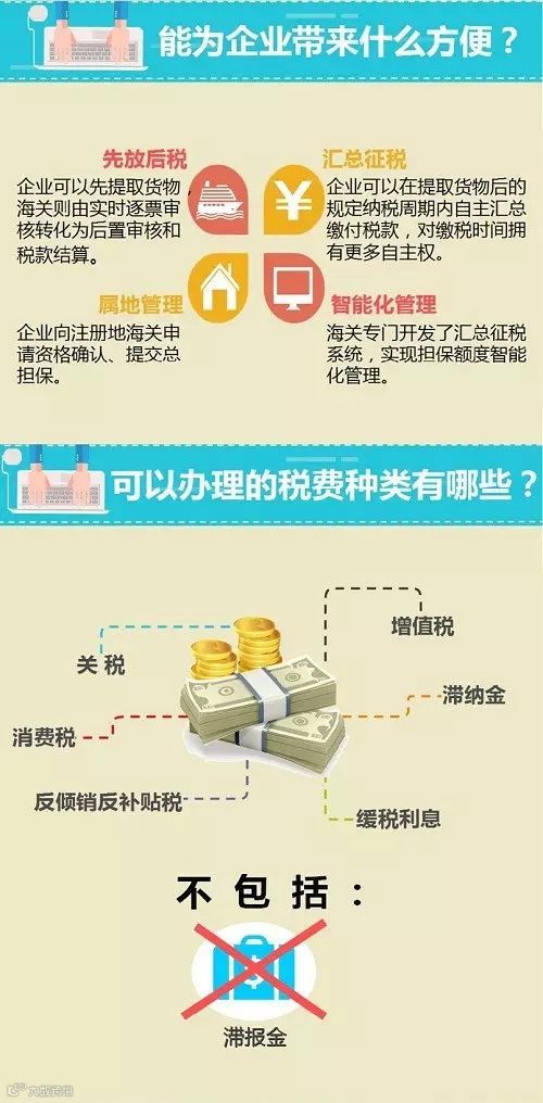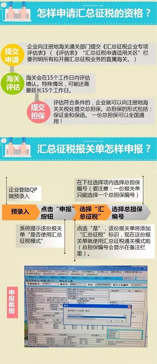 所谓汇总征税,即企业无需再向海关逐票申报纳税再提取货物,而是可以在提供税款担保后先行提取货物,事后在规定的纳税周期内汇总缴付税款。