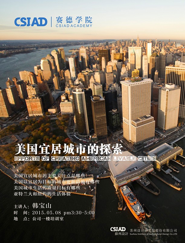导读:赛德学院首讲美国宜居城市的探索2015.05.08 pm3:30-5:00苏州设计一楼培训室活动介绍 主讲人