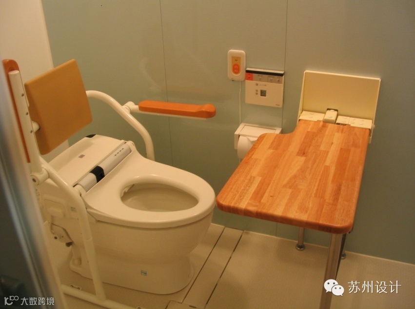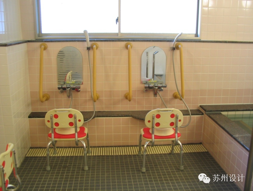 公共浴室的设计中有很多小细节注重人性化设计,为老人洗浴提供了便利:在浴室外设置等候区;更衣换鞋区也考虑到无障碍通行;浴室门口采用无高差设计;洗头座椅前方设置无障碍抓手,考虑老人起身站立的支托;为介护老人配置全自动多功能浴缸等。