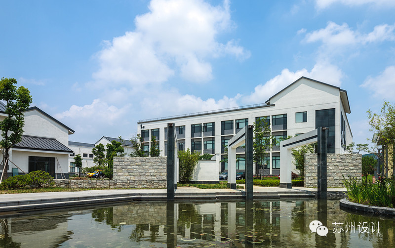 从苏州传统的民居建筑形态中汲取灵感,将大体量的建筑屋面作为第二层建筑基地,在“基地”上设置局部升起的坡屋顶体块,结合大面积的屋顶绿化,使建筑屋面造型最大限度的接近原基地自然村落的肌理效果,满足从天平山俯瞰的景观要求。通过在屋面局部升起的体块增加侧向可开启外窗及铝合金百页,很好的解决了大体量建筑内部采光及自然排烟的问题。