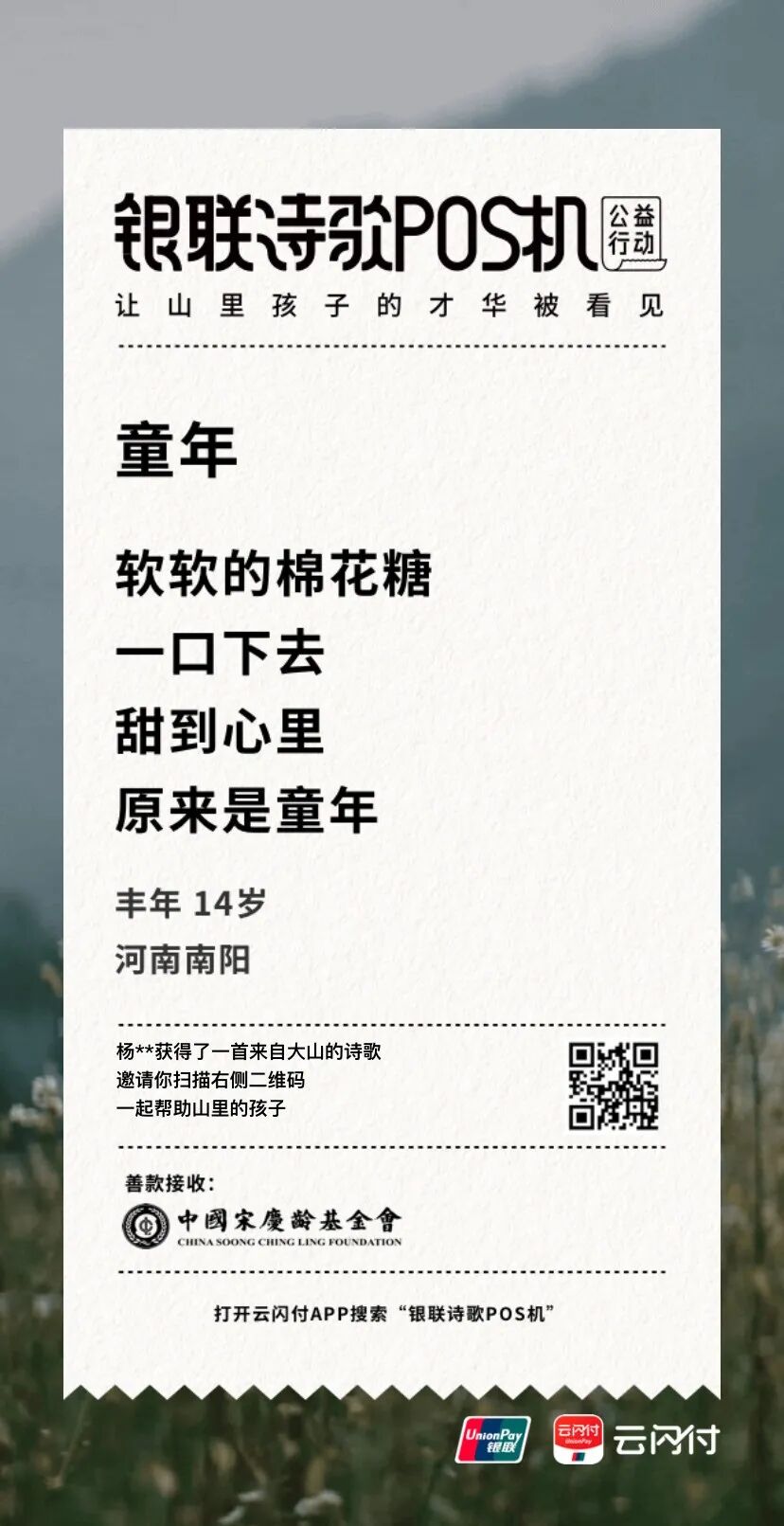 2019年诗歌POS机所募善款已陆续投入到安徽怀远、河南南阳、四川绵阳、新疆喀什、云南南华地区,累计帮助3140名困境儿童走进艺术素养课堂。数字是公益路上的一个标点,也是一个全新的起点,2020年是全面建成小康社会的决胜年,值云闪付APP用户突破3亿之际,中国银联再度启动了“银联诗歌POS机”公益行动。我们将积极践行社会责任,助力高质量打赢脱贫攻坚战及精神扶贫,帮助欠发达地区的少年儿童接受更好的教育。