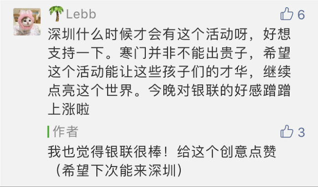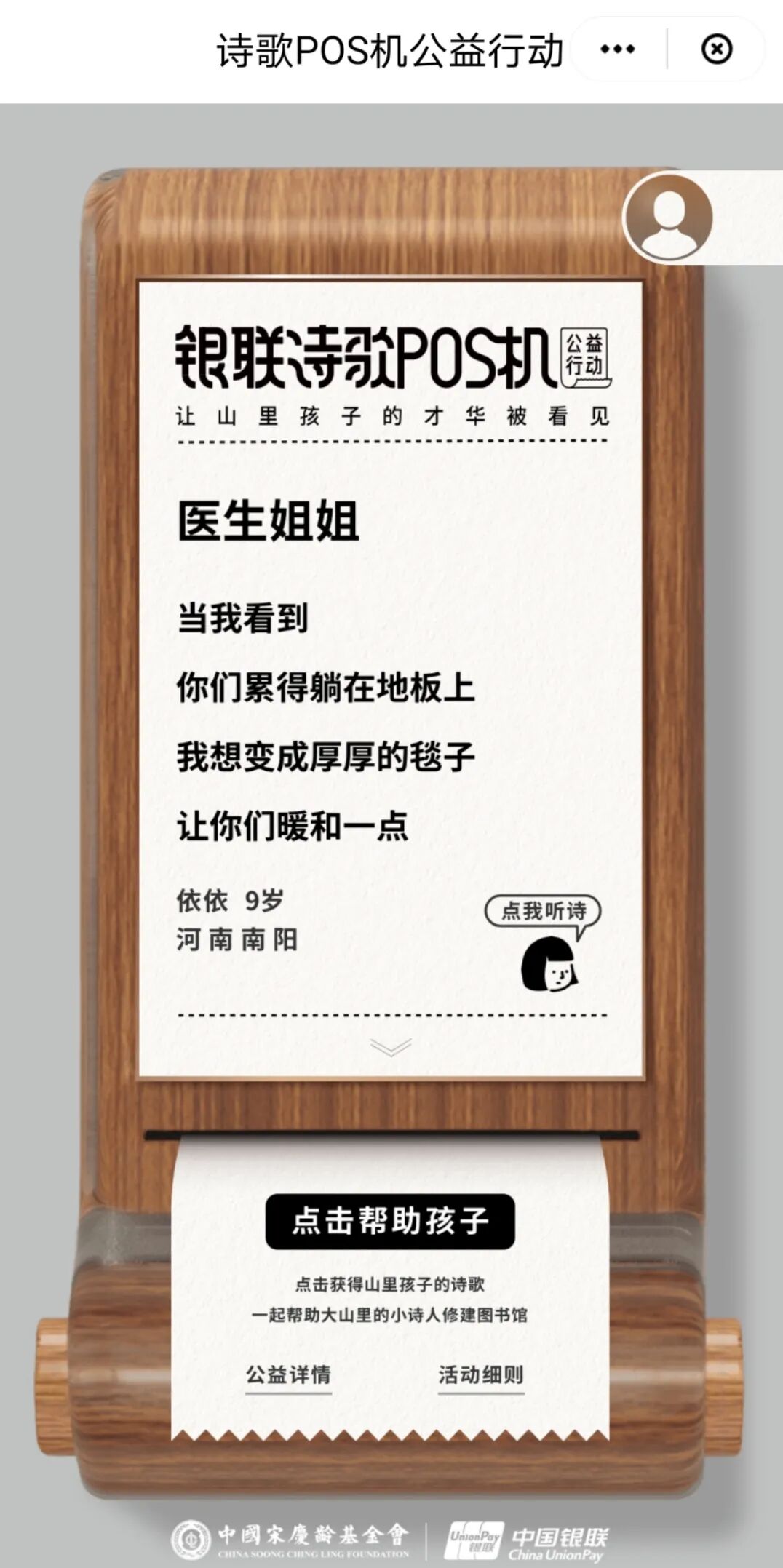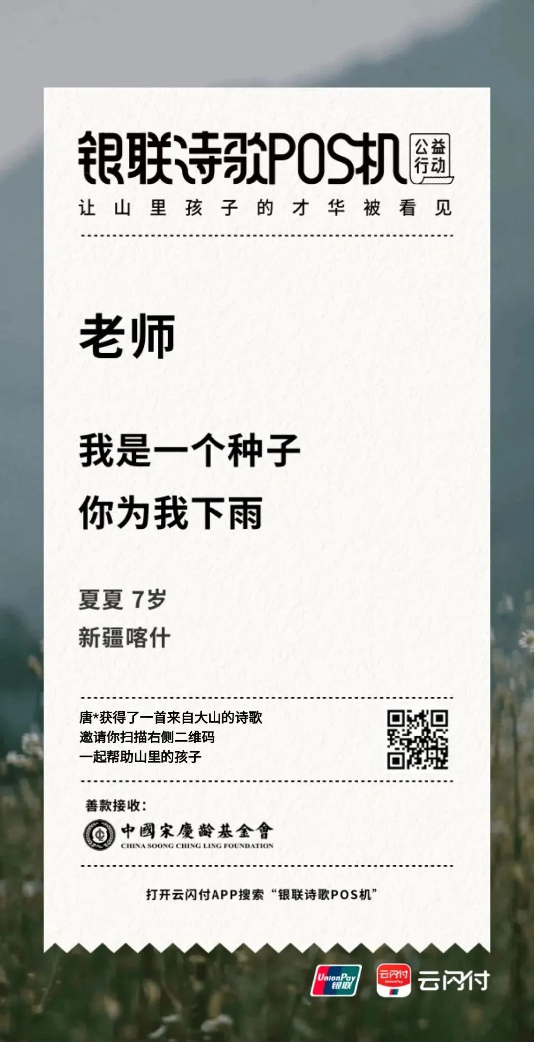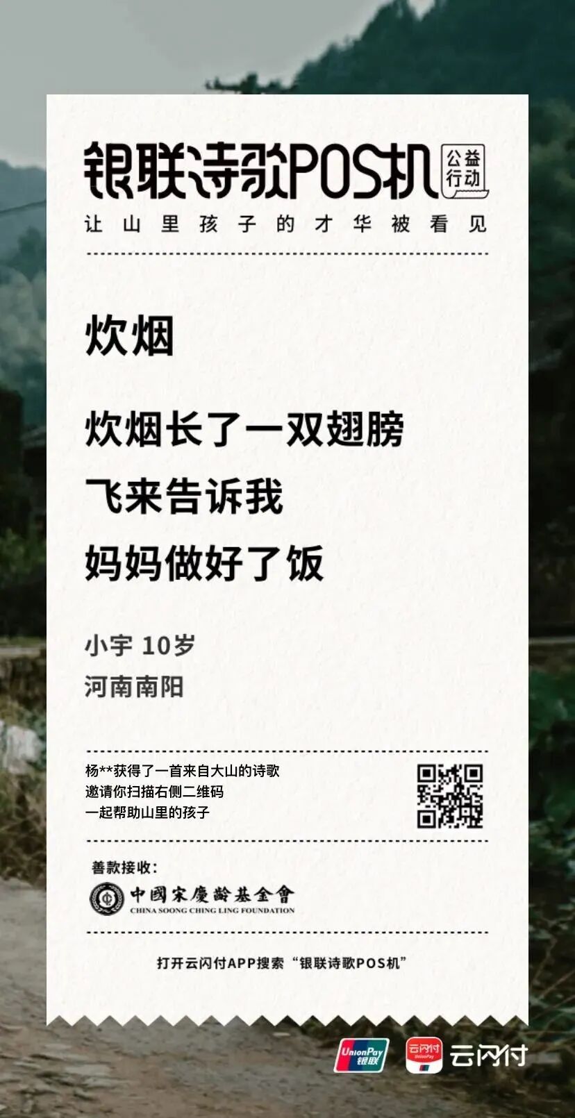 为了让更多人看到山里孩子的才华,不让时空阻隔人们对公益的热心,中国银联在今年开启诗歌POS机线上版,港澳版也同步上线,打开云闪付APP就能线上参与公益,跨越山海阻隔,让更多同胞在指尖的屏幕,就能看到孩子们的才华。