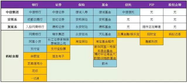 庞大的客户是需要金融产品来服务的。中国是奉行分业经营的国度,单单传统金融就有一行三会 - 央行,银监会,证监会,保监会来监管,所以金融业天生就存在不同的机构做不同的业务的规矩。传统的金融控股集团,通过集团子公司获取不同行业的牌照来占领各个金融领域的市场,但蚂蚁金服在短短的两年间,就已经完成了全牌照的布局,不但在每个关键领域都已经有相应的布局,而且在某些新兴的产品领域上已经摇摇领先即使是最早最全的金控集团- 中信集团。以下是一个简单的比较:
