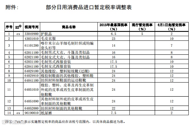 5月25日,财政部关税司发布公告:经国务院关税税则委员会研究提出并报国务院批准,自2015年6月1日起,我国将降低部分服装、鞋靴、护肤品、纸尿裤等日用消费品的进口关税税率,平均降幅超过50%。