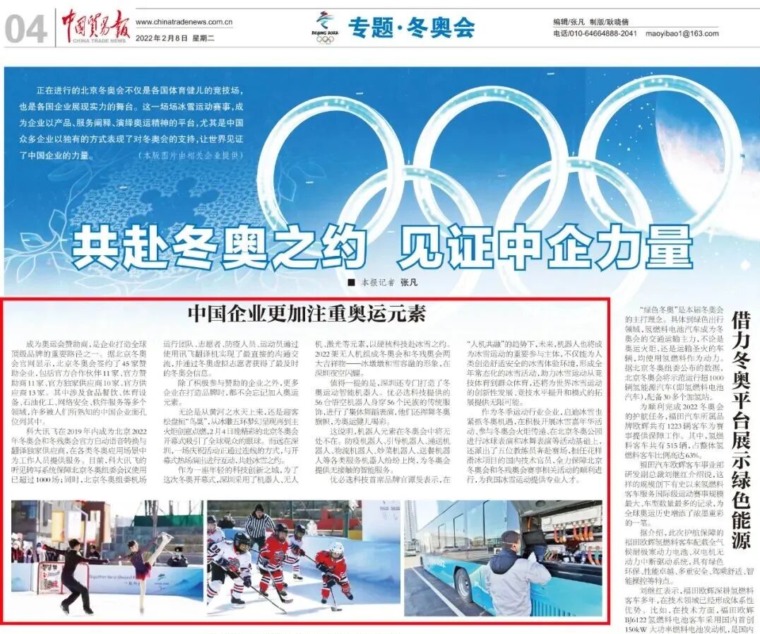 近日,《中国贸易报》以《共赴冬奥之约 见证中企力量》为题专题报道了中国代表性企业参与北京冬奥会的相关情况。报道指出,正在进行的北京冬奥会不仅是各国体育健儿的竞技场,也是各国企业展现实力的舞台。