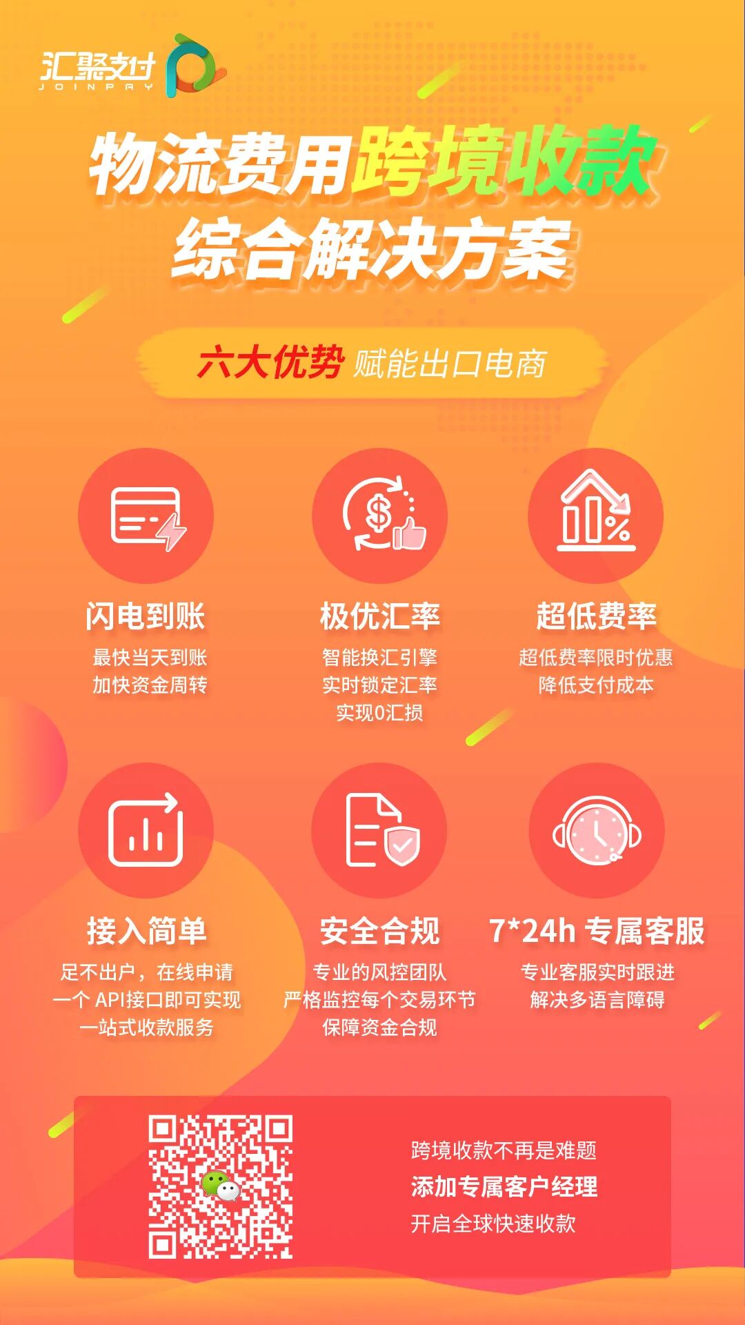 为解决出口电商企业物流费用的跨境收款问题,满足市场的需求,汇聚支付向目标电商企业推出物流费用跨境收款解决方案,与海外多个持牌资金渠道合作,提供境外换汇(如果商户不需要换汇,可以直接将人民币资金汇款至汇聚支付合作的境内银行)、资金入境、境内代付等配套服务,以六大优势赋能出口电商。