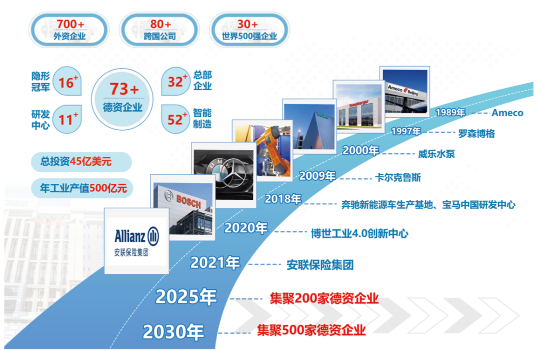 凭借顺义区坚实的产业基础、成熟的配套设施、充沛的高素质人才和通达全球的网络体系,中德产业园已集聚外资企业700余家。自招商及运营管理团队组建以来,园区在国际化品牌推广、全球招商推介等方面成果丰硕。目前,区内德资企业数量已增至73家,其中包括奔驰、宝马、博世、威乐、莱茵科斯特、惠乐喜乐等行业领军企业,总投资超45亿美元,年工业产值300亿元。同时,重点跟踪在谈德资项目63个,预计总投资超40亿元。