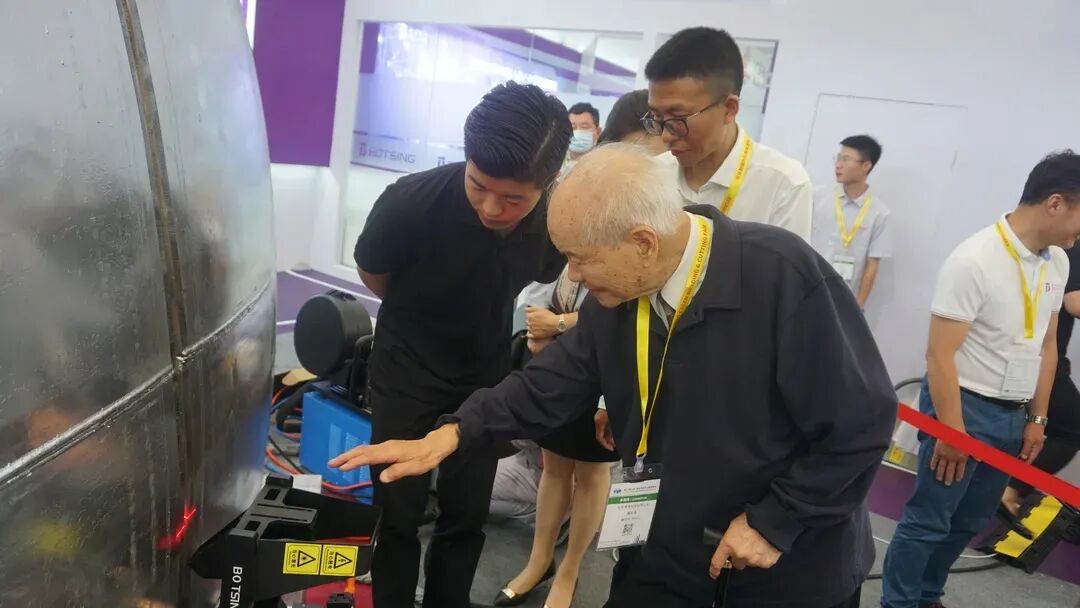 在第25届北京·埃森焊接与切割展览会上,博清科技携核心产品——无轨导全位置爬行焊接机器人精彩亮相。活动现场,94岁高龄的潘际銮院士亲临观摩指导,向大家讲解焊接机器人。