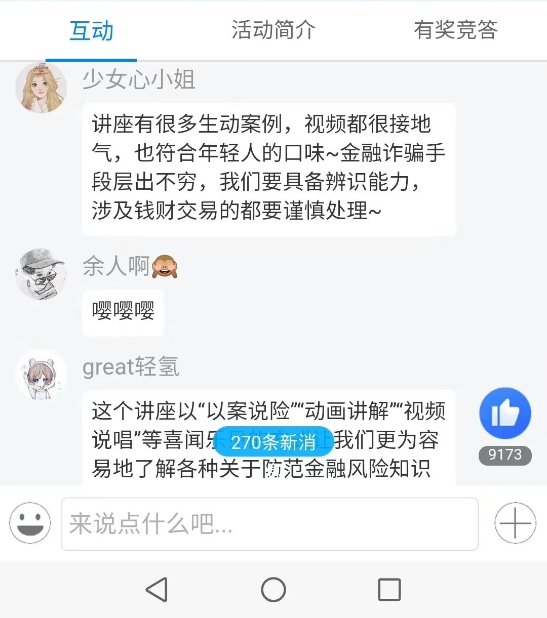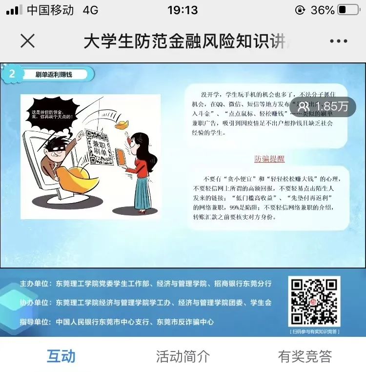 本次讲座结合疫情期间,采取线上直播形式,通过“以案说险”、“动画讲解”、“视频说唱”等喜闻乐见的形式进行。为增强讲座的趣味性,还特别设计了线上《金融防骗我有“招” 金融知识有奖竞答》环节,大学生们在线抢答问题,回答正确的还将获得礼品,互动环节得到了大学生们的踊跃参与。