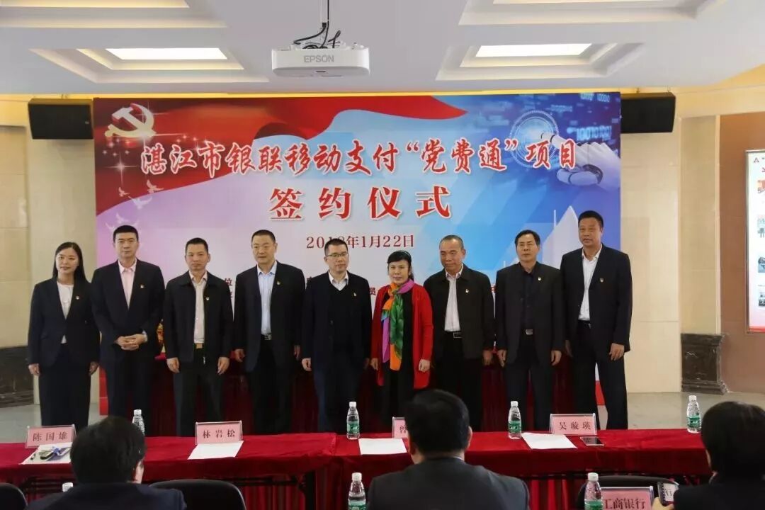 2018年1月22日,中共湛江市直属机关工作委员会、人民银行湛江中支、广东银联共同举办签约仪式,三方达成合作意向,推动全国首个银联移动支付“党费通”项目落户湛江,率先实现云闪付APP、线下POS终端使用银联卡进行党费缴纳和管理,全面打造便民高效的缴费模式。